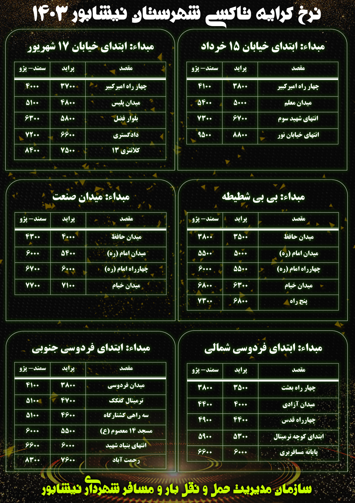 شما میتوانید با دانلود تصویر ضمیمه از کلیه نرخهای کرایه تاکسی در سال 1403 مطلع شوید. ضمنا" شما می توانید هرگونه انتقاد پیشنهاد یا شکایات خود را از طریق شماره تلفن 42255701 داخلی 34 با ما در میان بگذارید.